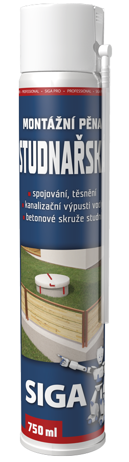 SIGA PRO MONTÁŽNÍ PĚNA STUDNAŘSKÁ SPRAY je jednokomponentní montážní polyuretanová pěna v aerosolu ke spojování a těsnění betonových skruží pro studny. Dále je vhodná k těsnění kanalizačních výpustí (kanalizací) a pro aplikace, které mají zabránit průtokům pitné, užitkové a dešťové vody.